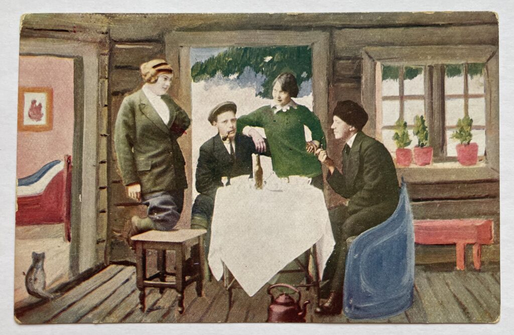 Kortene ved siden av, sendt ved juletider i perioden 1914 til 1918, viser unge damer ikledd turutstyr; mange av dem i bukser, men også en del med skjørt. Forfatteren Karsten Alnæs hevder at rundt 1910 ble «damebukser en mote som jentene fant smart, utfordrende og elegant» (Alnæs 1999, s. 101). Trøgstad lå nær hovedstadsområdet der nye trender kom tidlig. Når unge trøgstinger «dro til by`n», var Kristiania målet, og det er derfor er verdt å merke seg at Steen & Strøm allerede i 1886 stilte ut «turistdrakten» – et bukse-antrekk for ski/sportsdamer. Molstad & Co. fulgte opp i 1912 med sin buksedrakt for sommerbruk (op.cit). For meg kan det likevel se ut som mormors julekort speiler en annen virkelighet: Ski, kjelke og etter hvert sparkstøtting, var en nødvendighet i daglig gårdsdrift og hverdagsliv for både jenter og gutter, kvinner og menn i jordbruksbygder som Trøgstad. Dessuten var det på langt nær alle som hadde egne antrekk for vinteraktivitet; folk gikk på ski i hverdagsklærne sine. Samtidig var det fortsatt hissige motstemmer i buksedebatten, og Trøgstadungdom trengte ikke se lenger enn til Halden-området der ungdomslaget i Idd så sent som i 1914, hadde følgende innlegg i sin avis under overskriften: