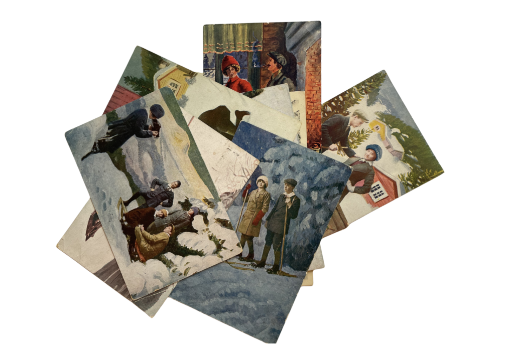 Postens portoregler gjorde at folk tidlig på 1900-tallet ofte nøyde seg med korte hilsener, og derfor ble bildesiden på julekortene desto viktigere. «Glædelig jul og godt nytaar» er den mest brukte hilsenen på kortene i mormor-samlingen, mens bildesiden på kortene viser unge kvinner og menn i snødekt natur, ofte med ski og kjelke, eller på «after-ski». Norsk vinter med damer og herrer som driver ulike friluftsaktiviteter, var de vanligste motivene på norske julekort de første tiårene etter 1900 (Ulvestad 1988). På tross av sin alminnelighet, kan jeg ikke la være å undres over hvorfor unge mennesker i den lille bygda Trøgstad valgte å sende nettopp disse kortene til min mormor. Hvilke ungdommelige drømmer og julefortellinger skjuler seg bak romantiske tablåer i vakre vinterlandskap?