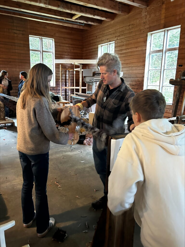 Aktivitetsutviklar ved gamlefabrikken, Torstein Tvinnereim tok i mot klassene saman med JaredTheis, Kristina Austi og Solrun Sunde. Opplegget var delt: Ein del der elevane fekk ein historiskgjennomgang og omvising på fabrikken, og ein praktisk del der dei fekk sjå og prøve ut ulikehandverk.